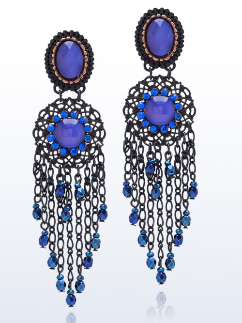 Ces splendides boucles d’oreilles sont trempées dans un bain d’argent oxydé noir mat. Des strass et des perles à facettes en cristal d’Autriche bleues intenses et zircon illuminent l’ensemble. Un anneau cuivre rose met en valeur le cabochon ovale à facette bleu/violet composant le clip.