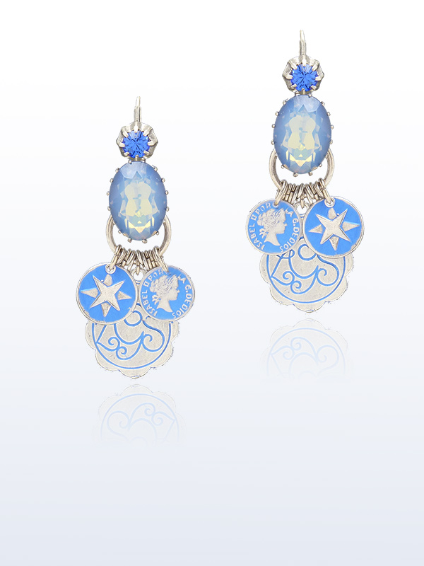 Ces superbes boucles d’oreilles d’inspiration bohème chic sont composées d’un cabochon à facettes en cristal de chez Swarovski ainsi que des breloques trempées dans un bain d’argent de 10 microns. Un pigment bleu jean poli à la main recouvre l’ensemble des pièces en métal.