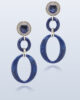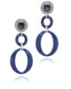 Matières: étain et laiton trempés dans un bain d’argent de 10 microns, des anneaux en résine bleue marine et un cabochon en verre.