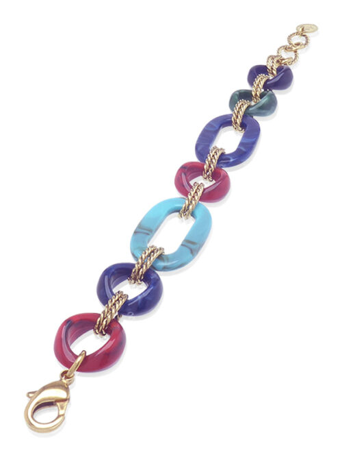 Ce bracelet original est plongé dans un bain d’or fin 24 carats. Il est composé d’éléments en acrylique marbré vert, bleu, rouge. Un bel équilibre original. Il existe dans différents coloris pour vous accompagner tout au long de la journée.
